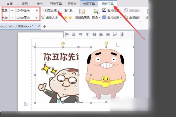5、点击工具栏中的”图片工具“,高度和宽度都输入10厘米,锁定纵横比前面的勾勾去掉。