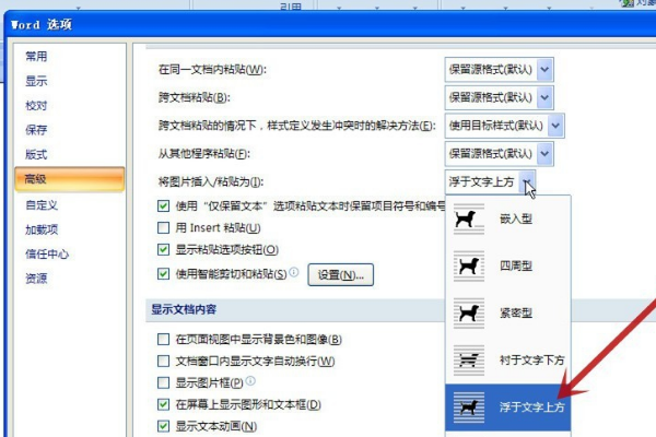 1、打开wold,新建立一个文档,点击“wold选项”点击“高级”,点击“浮于文字上方”。