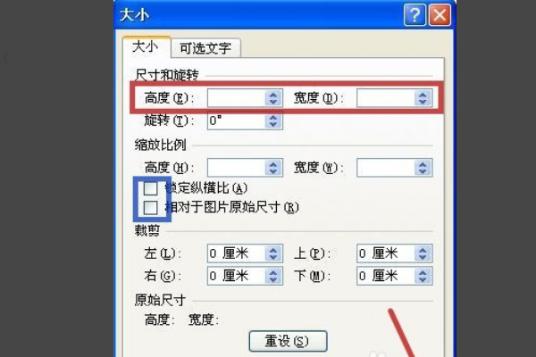 3、弹出大小对话框,去掉锁定纵横比和相对于图片原始尺寸复选框中的对勾,在高度和宽度输入框中输入所需要的数值即可,如图所示。