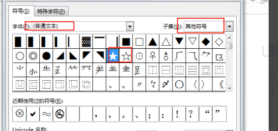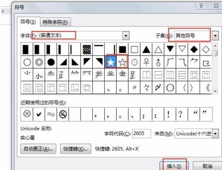3、然后我们在弹出来的窗口中字体选择普通文本,子集选择其他符号,找到实心五角星,然后点击插入就可以了。