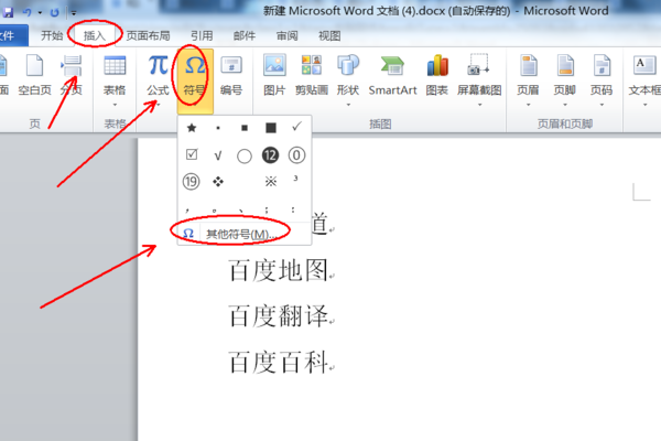 3、点击“符号”,在弹出的对话框里面继续选择“其他符号”;
