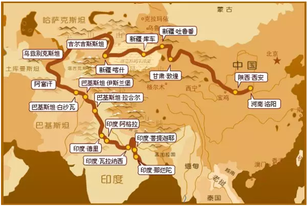 从今巴基斯坦北上——阿富汗——葱岭(帕米尔高原)——大流沙(塔克拉玛干沙漠)——敦煌——瓜州(今甘肃安西县东南)——长安;