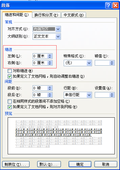 3、弹出段落对话框,将左侧、右侧缩进输入框中数值设置为0即可,如图所示。