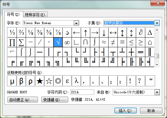 ②单击插入菜单中的单击符号,打开符号对话框,符号选项卡中的子集选择“数学运算符”,在下面找到“√”单击插入即可。