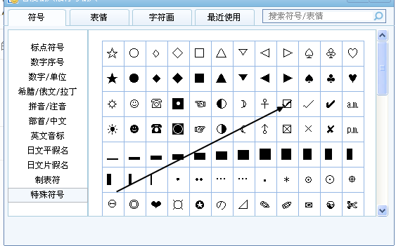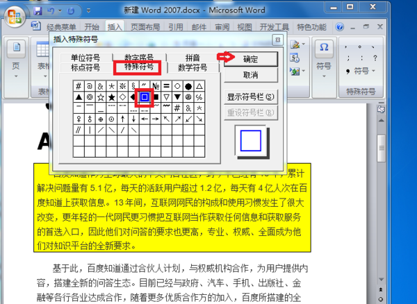 3、然后在出现的界面中,选择“特殊符号”页面中的“方框”符号,点击“确定”。