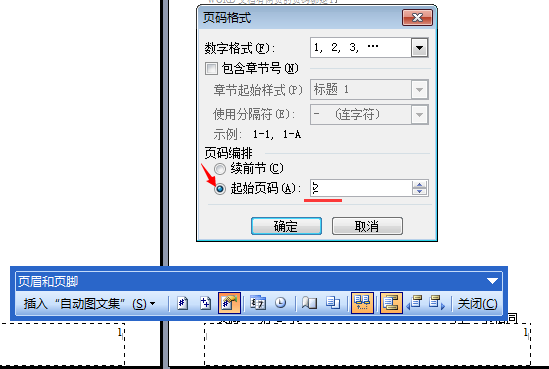 3 然后重新设置页眉页脚等、点击设置页码格式(弹出窗口)把页面编排中续前节改为起始页码,这时就可以发现“指定页”的页码从1开始了。