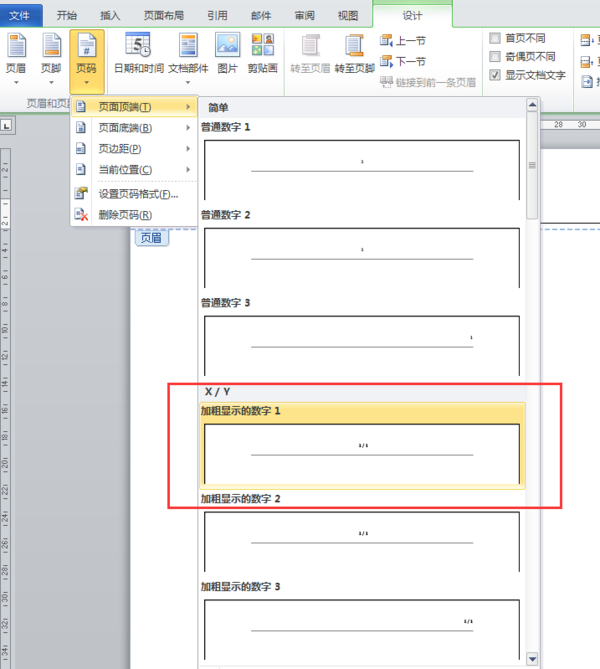 2、单击“设计”\"页码"\选择“X/Y”即可。