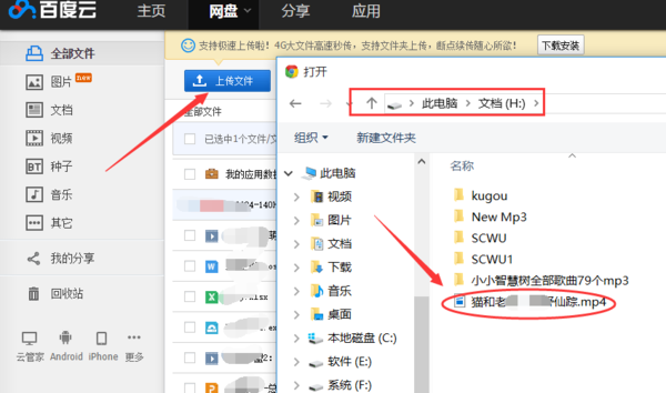 2、点击上传,找到下载到本地的腾讯视频文件,点击确定上传即可保存到百度云盘中。