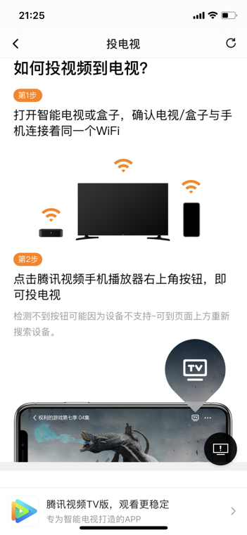 如果是智能电视下载腾讯视频软件这种,需要充值超级视频VIP,就是楼上说的成为TV云视听极光用户,还有一种就是直接利用手机腾讯视频软件,投视频到电视上,如下图