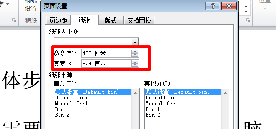 4、之后我们在弹出来的窗口中点击宽度和高度输入594mm×420mm,回车确定即可。