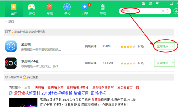 1、首先在电脑上的软件商店搜索视频剪辑软件,比如爱剪辑,搜索之后,点击右边的立即下载安装(因为我电脑里已经下载了,所以显示的是立即开启):