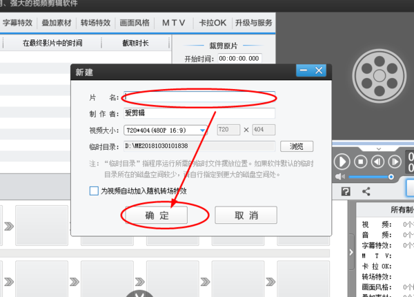 2、安装之后,进入爱剪辑,就会跳出一个对话框,你可以为你所要剪辑的视频编辑名字,如下图: