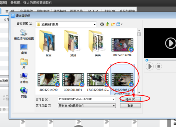 4、点击添加视频之后,就会跳出一个对话框,选中你想要剪辑的视频点击打开,如下图: