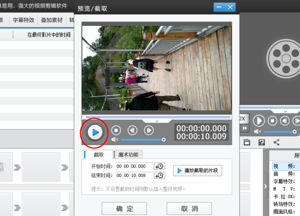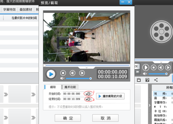 7、视频剪辑好以后,可以点击播放截取的片断按钮,进行预览,如果需要微调,可以在开始时间栏或结束时间栏中直接进行时间修改。修改好之后,就点击下方的确定按钮,就完成了该视频的剪辑,如下图所示: