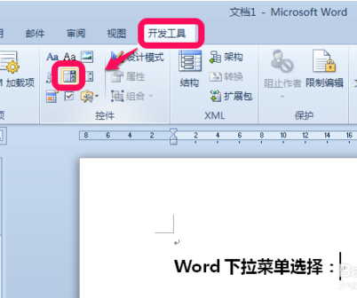 3、这时在word的上方功能选项卡上就会有【开发工具】一项了。接下来,把光标放置在需要插入下拉菜单的位置,然后点击【开发工具】—【组合框内容控件】的图标上。