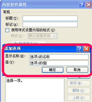 6、点击添加后,依次输入选项的名称和值,点击【确定】。