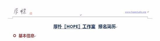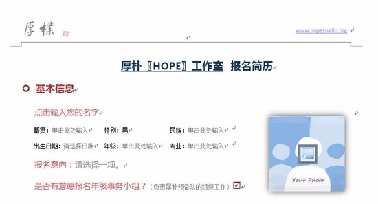 4.为了使报名简历更整齐美观,用表格制作,插入2*1表格,左边输入基本信息部分的文字,右边放图片。