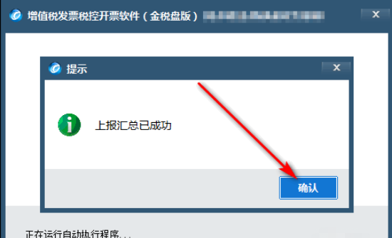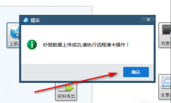 6、点击上报汇总图标后,系统开始执行操作,等待几分钟,页面会弹出抄税数据上传成功,就表示已经上报汇总成功了,点击确认即可。