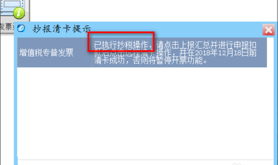 3、点击确认后,系统跳转到开票系统界面,过入系统界面后,在页面右下角,会弹出报税清卡提示:已执行抄税操作,就表示已经上报汇总成功了。
