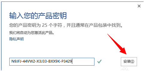 接着在弹出的“输入您的产品密钥”窗口中,输入以下微软官方给出的密钥:n9jfj-44vw2-x3j33-bxx9k-p3429NKGG6-WBPCC-HXWMY-6DQGJ-CPQVG点击“安装”按钮进行激活操作。