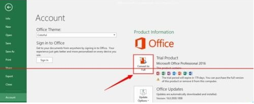此外,我们也可以通过点击“Office按钮”,从打开的扩展菜单中选择“Accout”菜单项,同时点击“Convert to Full”按钮。