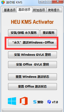当然,我们也可以使用KMS工具来激活Office2016。由于Office2016目前是预览版,因此其内核仍然是Office2013架构。对此运行“KMS激活工具”,在其主界面中点击“高级选项”卡,点击“永久激活Windows+office”按钮。