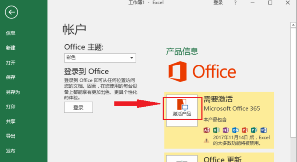 2、在文件菜单中,选择帐户页签,可以看到Office 2016的状态是需要激活,点击激活的按钮。