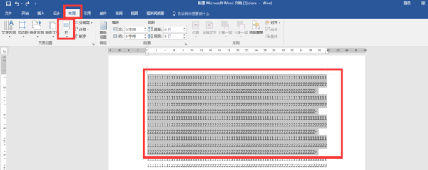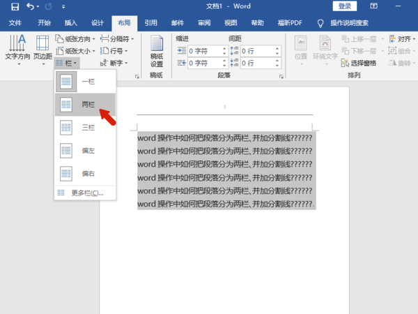 3、选中想要进行分栏的内容,然后在布局菜单下找到菜单分栏,点击后会弹出选择分栏的栏数,这里我们选择两栏。