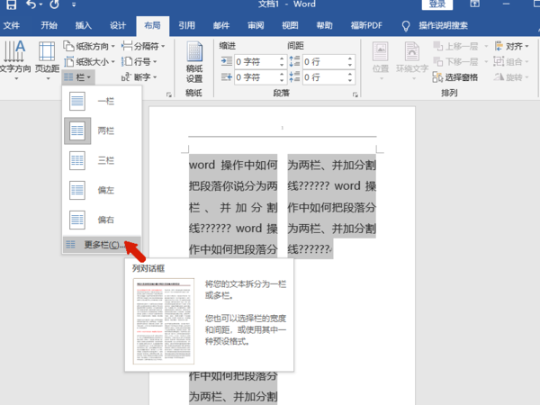 因本人太懒,就不附上图了。打开布局,里面有分栏的,选择栏数,如果你想分很多栏就点更多栏,里面有分隔线的宽度颜色什么鬼的设置。如果你想全部分到左边或者右边或者一段里面的句子在一起而不是随着分栏跑到右边去,就点开段落设置,选择换行和分页,段中不分页就是一段在一起了,段中不分页就你选择的在一起了,最后你想应用于整篇文档还是你选择的段落之前就可以在分栏里面设置,不要问我是谁我是雷峰。