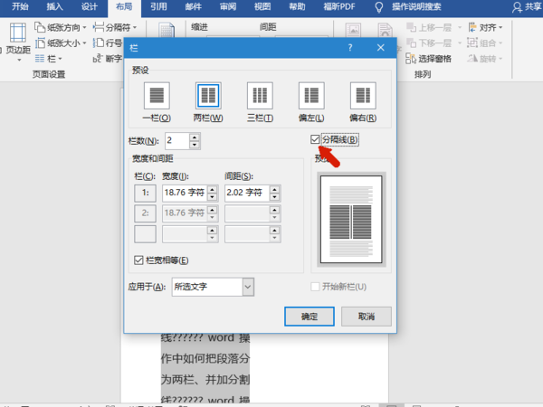 第二步:在弹出的“分栏”选项框中选择两栏或者三栏等,确定即可。
