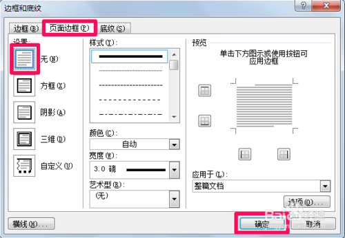 在边框和底纹中选择页面边框,然后点击无,最后点击确定。