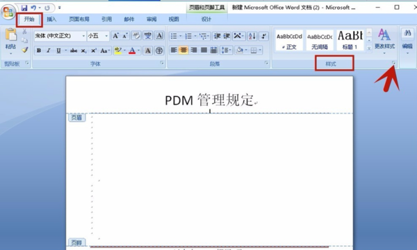 2、双击页眉处选中页眉;点击“开始”菜单下的“样式"右下角的小箭头按钮
