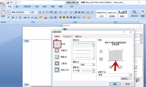 6、弹出”边框和底纹“的对话框看到箭头所指的地方有一条横线,就是页眉的横线,将它点击一下,或者在左边将选框设置成“无”,再点击“确定”。
