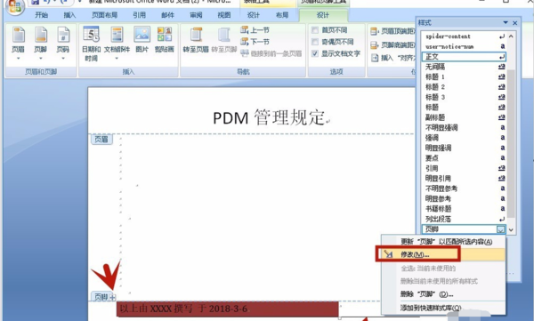 鼠标移到页眉后面的按钮,会出现一个三角按钮,点击会有下拉菜单,然后选择修改
