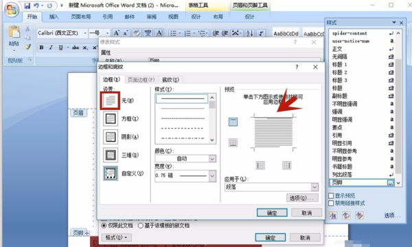 的“无”,最后依次点击按钮〔确定〕和〔应用〕。你会发现页眉下的横线同样消失了。