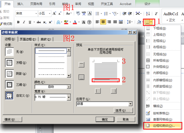 补充:如想页脚处添加横线或删除横线,同样是打开边框与底纹对话框,在图2中的3处点击添加或删除。