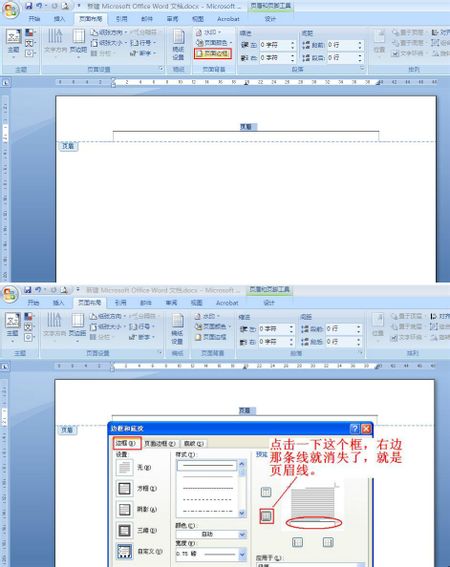 选中页眉,点击“页面边框”,选“边框”,在右边的预览界面,点击下边线,即可去掉页眉线。