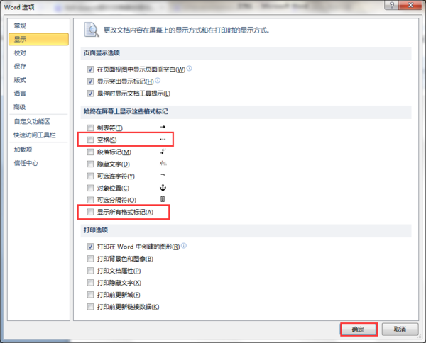 2、切换到“显示”页面,取消“空格”和“显示所有格式标记”前的对勾,点击确定。
