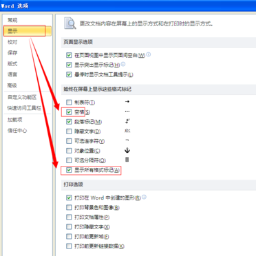 2、在【显示】标签页下,去掉【空格】和【显示所有标记】前面的勾。