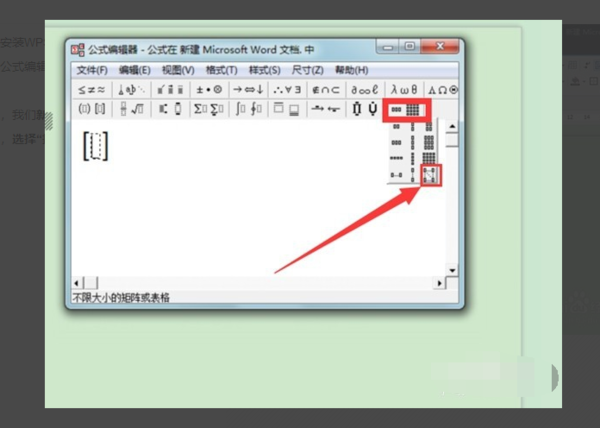 5、选择之后,我们还要选择矩阵模板,要确定矩阵的行数和列数,我们点击如图那个表示”矩阵模板“的图标,然后点击最后那个模板,即可进入设置行列数目的页面。