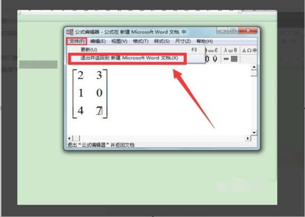 8、输入完毕之后,我们就可以看到这个矩阵了,确定之后,单击”文件“下面的”退出并保存到文档“即可添加到word文档中啦。