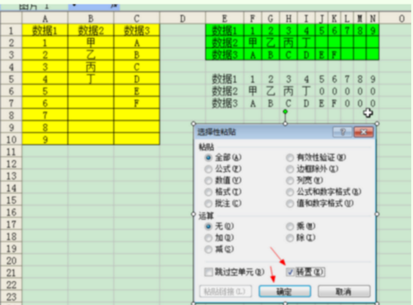 6、在弹出的窗口中勾选“转置 ”选项,并确定(最关键的步骤);