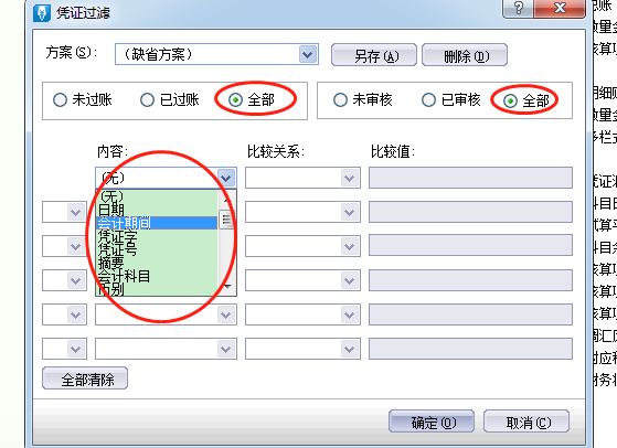 3.选择凭证查询的条件,比如选择会计期间所有的凭证,选择“全部”,点击确定,如下图;