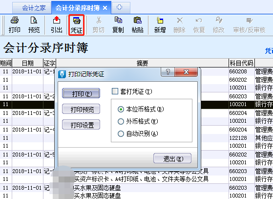 在打开你需要连续打印的凭证的会计分录序时簿后,点击上面“文件”----“打印凭证”-----“打印预览”,当然在这之前,你要先设计好你用纸张的尺寸,还有套打格式,再点击打印就可以连续把凭证打印出来了