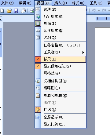 打开word2003,点击菜单栏中的“视图”选项,下拉查看“标尺”选项,勾选后即可查看到垂直标尺。