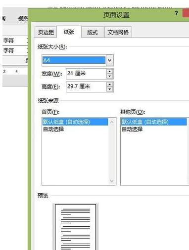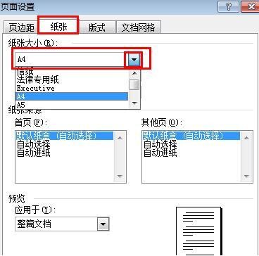 2,打开“页面设置”对话框,切换到“纸张”选项卡。在“纸张大小”下拉列表中选择合适的纸张的类型,例如选择“A4”纸张。