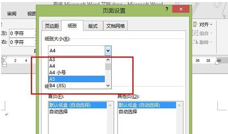 步骤四:在打开的页面设置中,就看到了下面图片所示的下拉菜单选项,可以拥有更多的纸张选择,默认为A4尺寸。