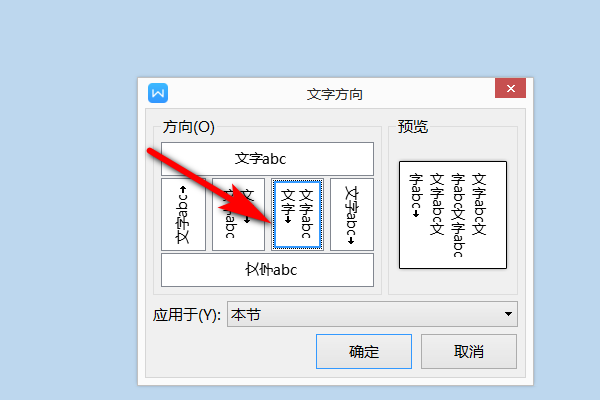 5、进入之后,在文字方向里面选择横向的即可,这样就能在WORD文档中横向打字。