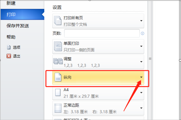 2、在右边的打印设置框里,找到纵向这一栏,点击右边的倒三角图标;