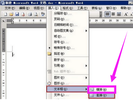 1、打开Word文档点击菜单栏中的“插入”→“文本框”→“横排”;